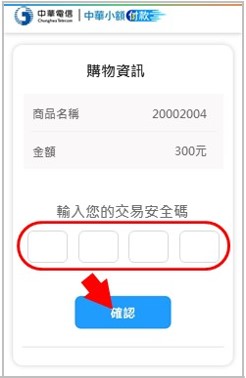 請輸入您開通小額付款時設定的「4碼安全碼」,再按下「 確認」按鈕