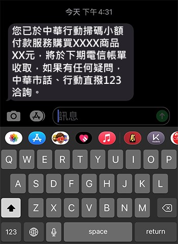 交易成功後,將收到交易成功簡訊,中華電信依消費金額併入電信帳單,不另加收相關處理費用。